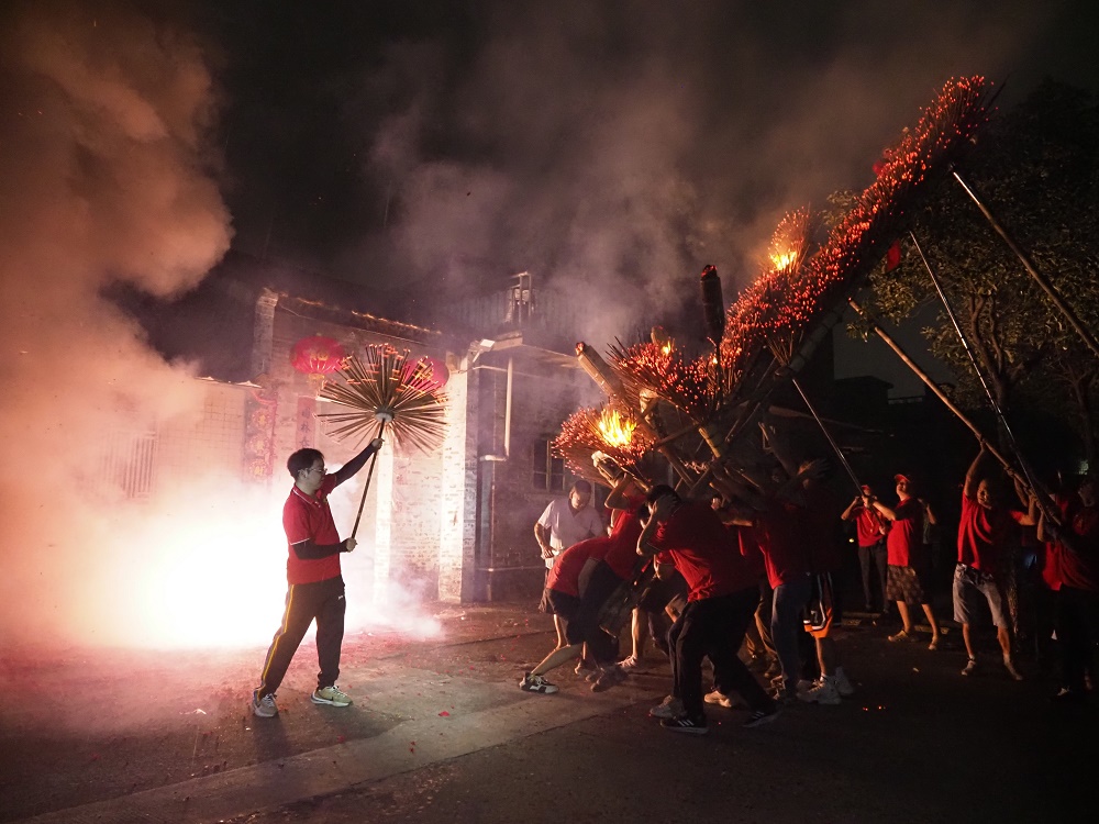 陳山村民燃放鞭炮迎接香火龍。江門日報(bào)記者 張澤彬攝