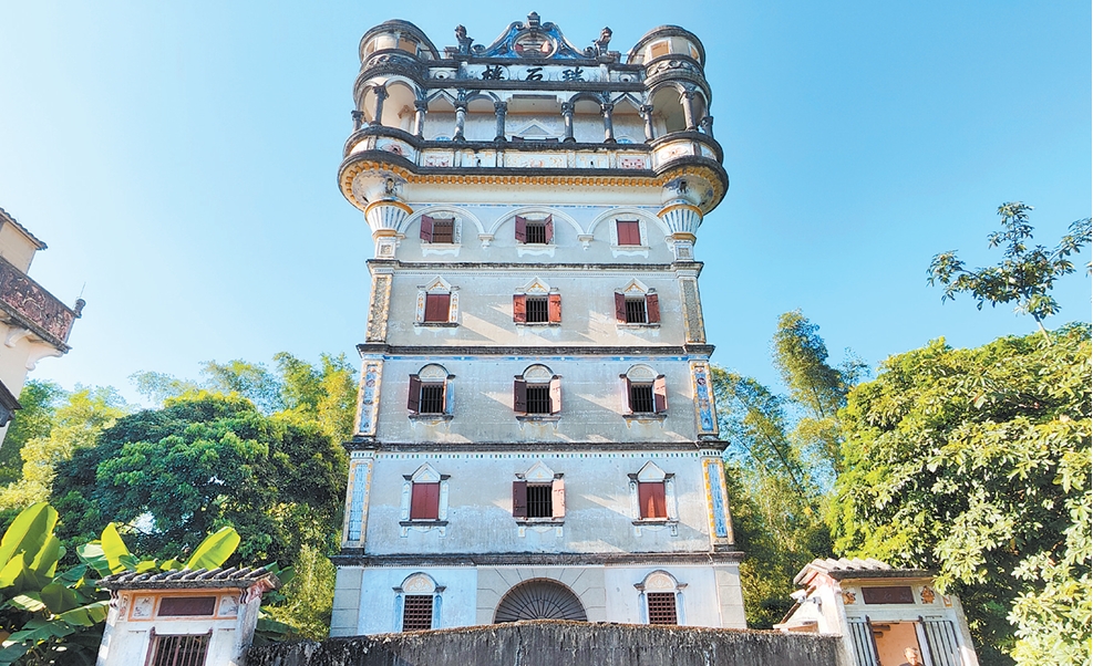 ????初抵開平市蜆岡鎮(zhèn),一塊顯眼的廣告牌映入眼簾,其上赫然寫著——“碉樓之王在蜆岡”。懷揣著幾分好奇,記者乘車前往蜆岡鎮(zhèn)錦江里碉樓群。剛踏入這片地界,抬頭即可望見矗立于鄉(xiāng)野之中的瑞石樓。這座完美融合了中西建筑風(fēng)格的碉樓,不僅是開平現(xiàn)存最高、最美的碉樓,更被譽(yù)為“開平碉樓第一樓”。