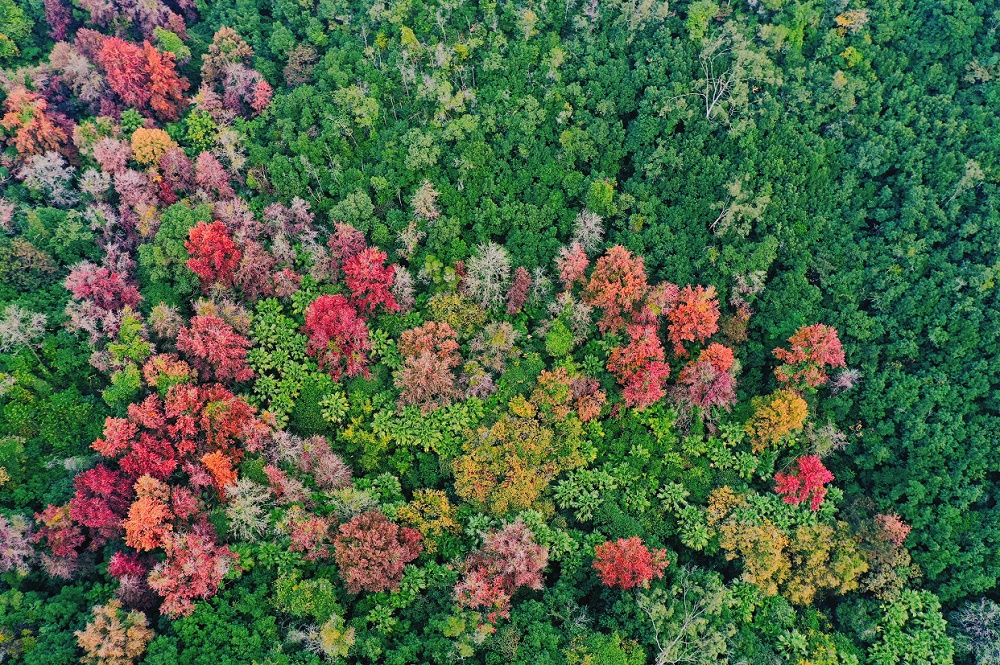 ????12月24日下午,記者順著圭峰山登山古道拾級而上,山上樹木高低掩映,郁郁蔥蔥,沿路可見枝頭楓葉分外紅。在太陽的映照下,粉紅、桃紅、鮮紅、深紅……好像打翻了調(diào)色盤一樣,給蒼郁的圭峰山增添了一分瑰麗,不少市民用手機(jī)記錄下這美好一刻。