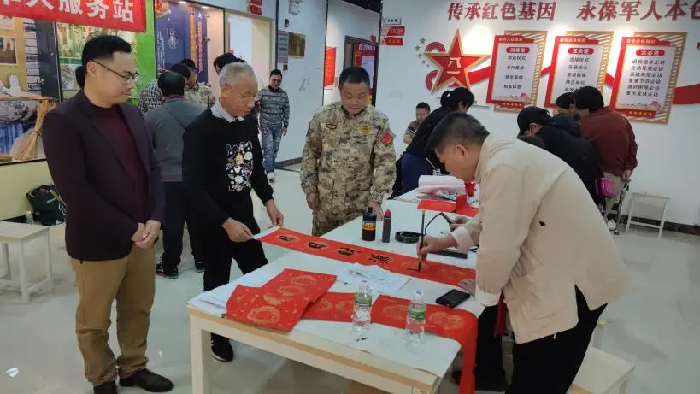 近日,蓬江區(qū)在白沙街道退役軍人服務(wù)站組織開展“關(guān)愛軍人送春聯(lián)、情暖老兵送祝?!敝黝}活動(dòng),邀請(qǐng)廣東省硬筆書法協(xié)會(huì)書法家集中街道退役軍人服務(wù)站書寫春聯(lián),向轄區(qū)內(nèi)退役軍人和其他優(yōu)撫對(duì)象現(xiàn)場(chǎng)書送春聯(lián),并把新春的祝福送到了轄區(qū)抗美援朝老兵及家屬手中,將黨和政府的關(guān)心關(guān)懷送到老兵心坎上,積極營(yíng)造全社會(huì)銘記歷史、尊重退役軍人的良好社會(huì)氛圍。