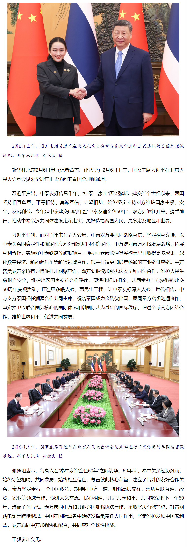 習(xí)近平會(huì)見(jiàn)泰國(guó)總理佩通坦
