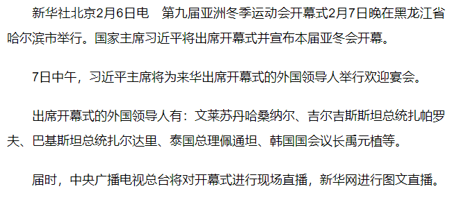 習(xí)近平將出席哈爾濱第九屆亞洲冬季運(yùn)動(dòng)會(huì)開幕式并舉行外事活動(dòng)