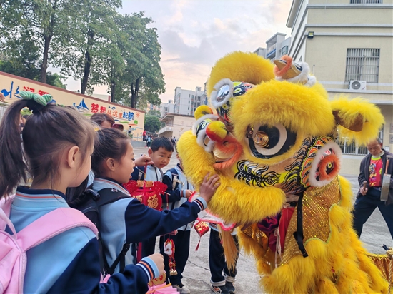 臺(tái)山市四九鎮(zhèn)中心小學(xué)學(xué)生“摸摸獅頭”。