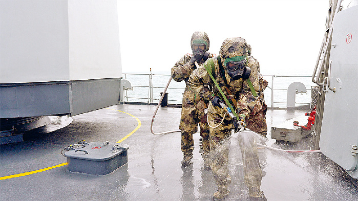 茫茫大海,就是錘煉作戰(zhàn)利劍的“淬火池”?!扒胺胶S虬l(fā)現(xiàn)異常煙霧,防化學武器部署!”機動途中,新的“敵情”傳來,編隊艦艇開啟全艦水幕系統(tǒng),官兵快速穿戴防護裝具,投入新一輪訓練……