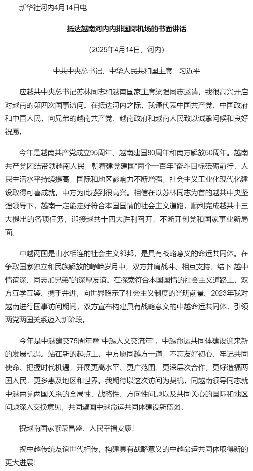 習(xí)近平抵達(dá)越南河內(nèi)內(nèi)排國際機(jī)場(chǎng)發(fā)表書面講話