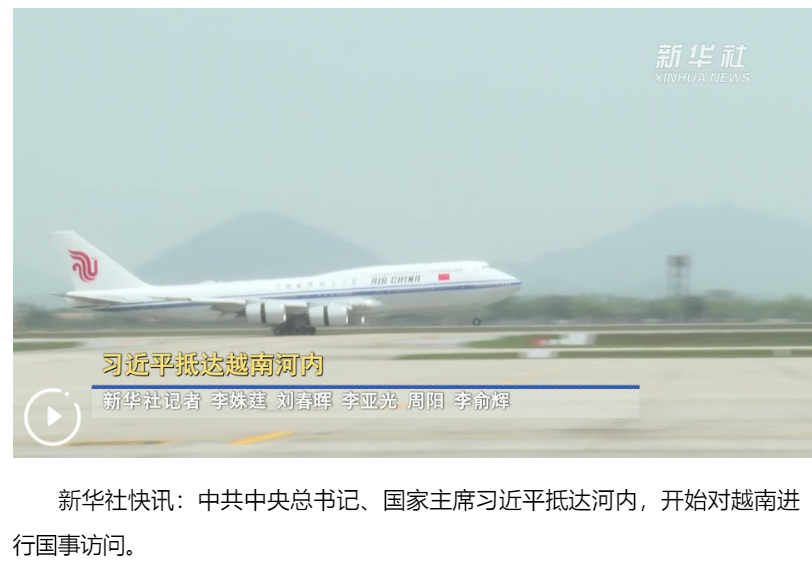 新華社快訊:中共中央總書(shū)記、國(guó)家主席習(xí)近平抵達(dá)河內(nèi),開(kāi)始對(duì)越南進(jìn)行國(guó)事訪問(wèn)