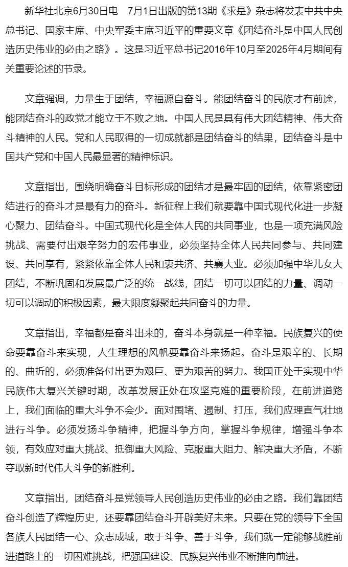 《求是》雜志發(fā)表習(xí)近平總書記重要文章《團結(jié)奮斗是中國人民創(chuàng)造歷史偉業(yè)的必由之路》