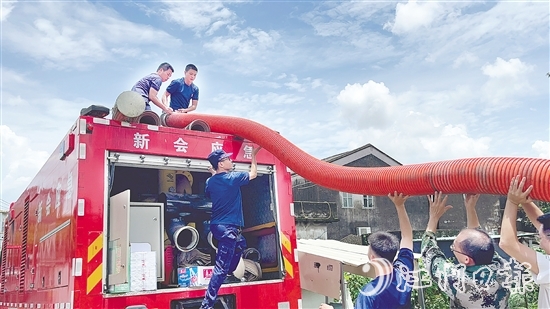 ????應急隊伍攜帶“龍吸水”子母排洪車、大流量泵車等排澇裝備,分批到雙水鎮(zhèn)東凌村、新會智造產業(yè)園大澤園區(qū)、圭峰會城七堡工貿城社區(qū)等多處開展排澇搶險。