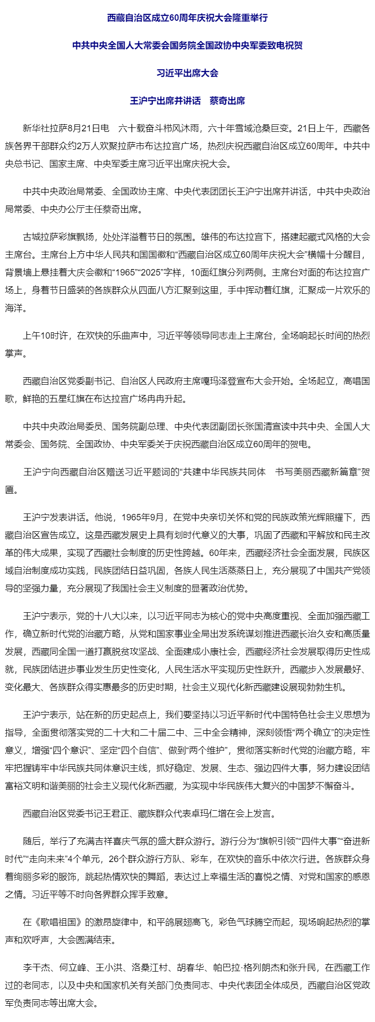 西藏自治區(qū)成立60周年慶祝大會(huì)隆重舉行 習(xí)近平出席大會(huì)