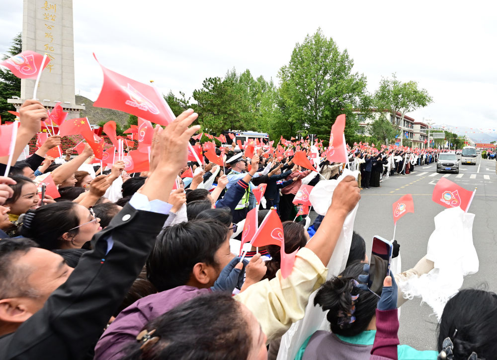 ??人群如潮水涌到道路兩旁,揮舞紅旗、手捧哈達,高呼“扎西德勒”,聲聲祝福是“感恩總書記、感恩黨中央”的由衷表達。習近平總書記拉開車窗,微笑著向人群揮手致意。