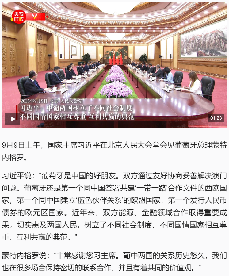 習(xí)近平:中葡兩國樹立了不同社會制度 不同國情國家相互尊重 互利共贏的典范