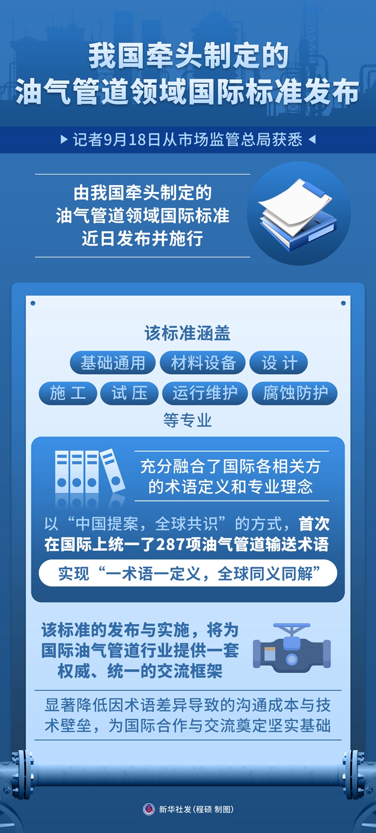 ??新華社北京9月18日電(記者趙文君)記者18日從市場監(jiān)管總局獲悉,由我國牽頭制定的油氣管道領(lǐng)域國際標準近日發(fā)布并施行。