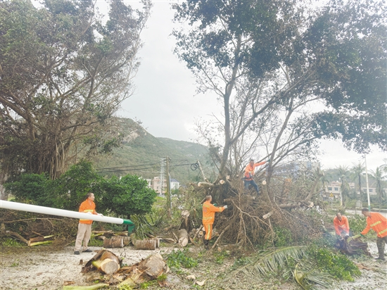 在上川島、下川島,各方搶險(xiǎn)救援力量已陸續(xù)到位。圖為交通系統(tǒng)工作人員正在清理倒伏樹木,全力恢復(fù)交通。畢松杰 攝