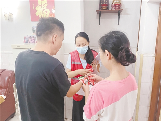 鶴山沙坪街道和平社區(qū)工作人員向居民發(fā)放滅蚊煙片,并介紹其科學(xué)使用方法。諶磊 攝