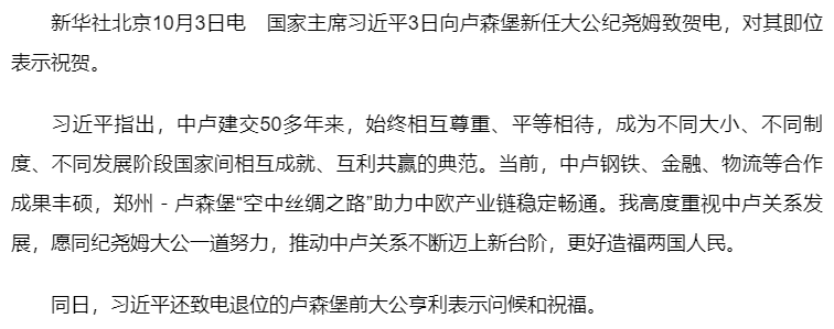 習(xí)近平致電祝賀盧森堡大公紀(jì)堯姆即位
