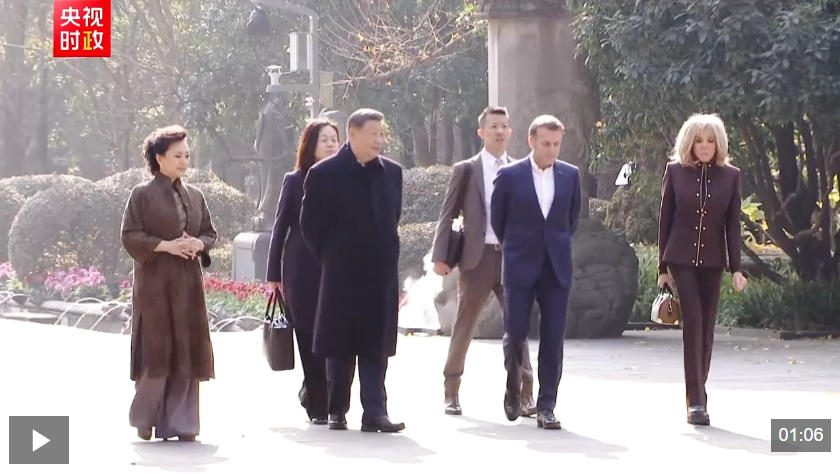 ??初冬的都江堰,蒼山掩翠。馬克龍夫婦抵達(dá)時(shí),受到習(xí)近平和彭麗媛熱情迎接。兩國(guó)元首夫婦沿堰功道邊走邊談。習(xí)近平介紹都江堰歷史和意義,指出都江堰水利工程是全世界迄今唯一仍在使用的古代水利工程,也是人類與自然和諧共生最早的成功實(shí)踐之一,修建過(guò)程充分反映了中華民族自強(qiáng)不息、不畏艱難、勇于開(kāi)拓的精神。兩國(guó)元首夫婦落座懷古亭,臨水品茗,縱論天下。