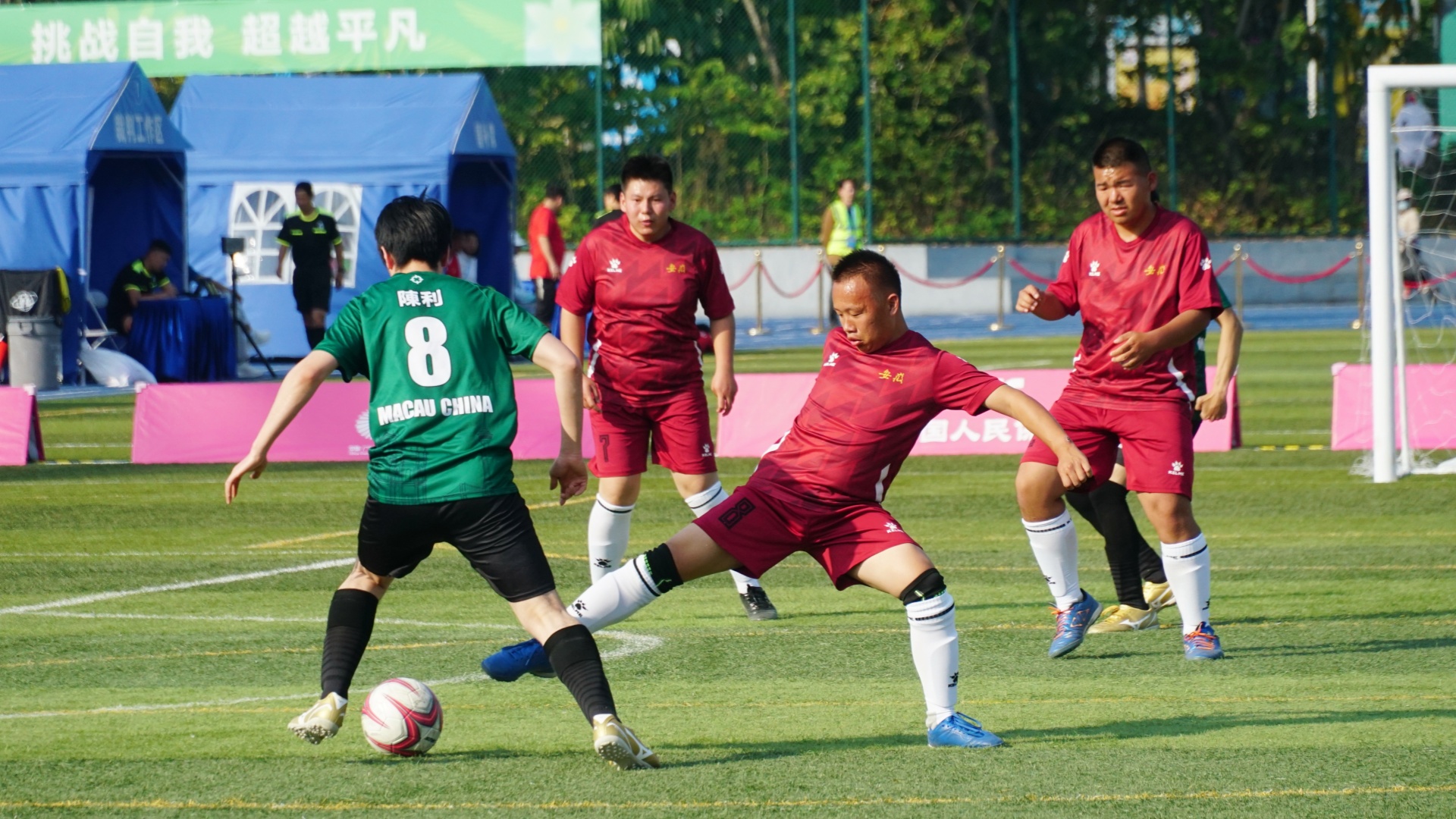 特奧足球運動員們奔跑、搶球,積極投入比賽。 郭永樂 攝