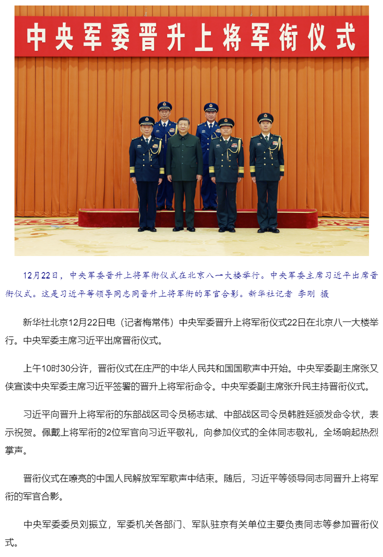 中央軍委舉行晉升上將軍銜儀式 習(xí)近平頒發(fā)命令狀并向晉銜的軍官表示祝賀