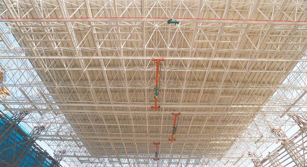 ????“相當(dāng)于一口氣將4架空客A380精準(zhǔn)抬升至7層樓高!”項(xiàng)目經(jīng)理張紅陽(yáng)介紹說(shuō),“我們?cè)诘孛嫱瓿删W(wǎng)架、吊車(chē)梁、設(shè)備梁及屋面檁條的整體拼裝,再整體提升,最大限度保障了結(jié)構(gòu)安全與安裝精度,為關(guān)鍵直流設(shè)備打造了一個(gè)最堅(jiān)固的‘保護(hù)殼’?!?/p>