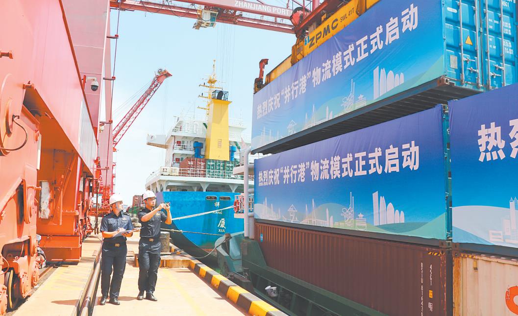 9月26日,“南航757”輪船自廣東湛江港啟航,將途經(jīng)海南洋浦港、深圳蛇口港,卸裝集拼三地的內(nèi)外貿(mào)貨物,最終前往亞歐國家。這標(biāo)志著“并行港”物流模式改革試點首票業(yè)務(wù)成功開通。模式成熟運營后,預(yù)計三港間船舶裝載率將由30%提升到最高80%,投入運力減少50%以上,集裝箱物流成本大幅降低,為粵港澳大灣區(qū)和海南自貿(mào)港聯(lián)動發(fā)展增添新動能。這種模式對江門也是一種有益的啟示。新華社發(fā)