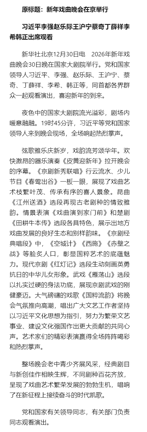 新年戲曲晚會(huì)在京舉行 習(xí)近平等出席觀看