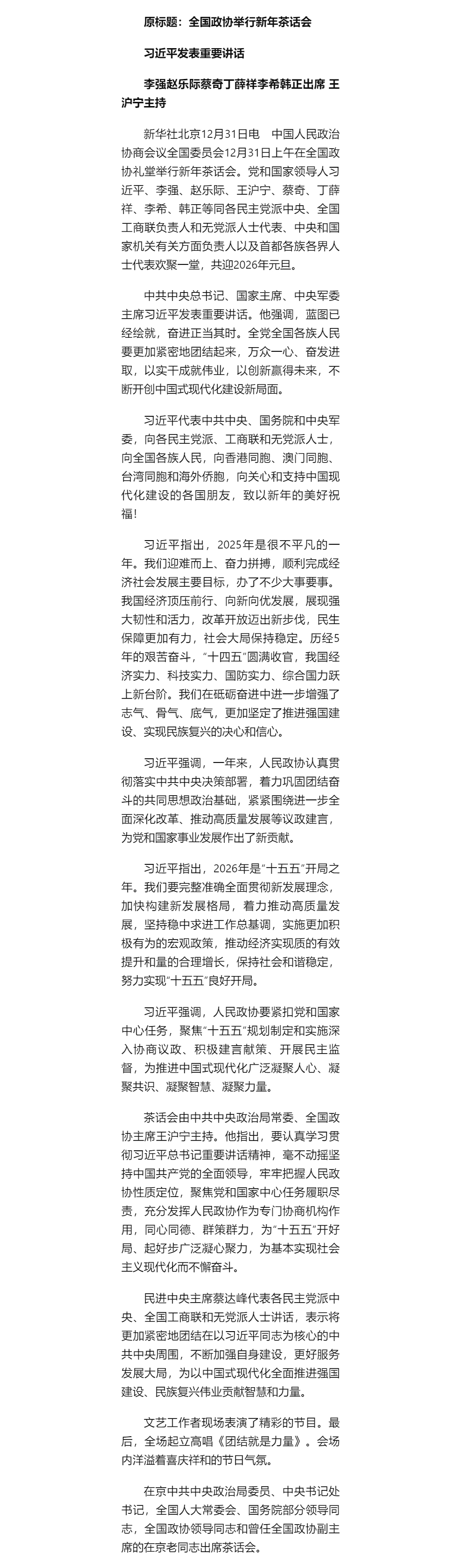 全國政協(xié)舉行新年茶話會 習(xí)近平發(fā)表重要講話