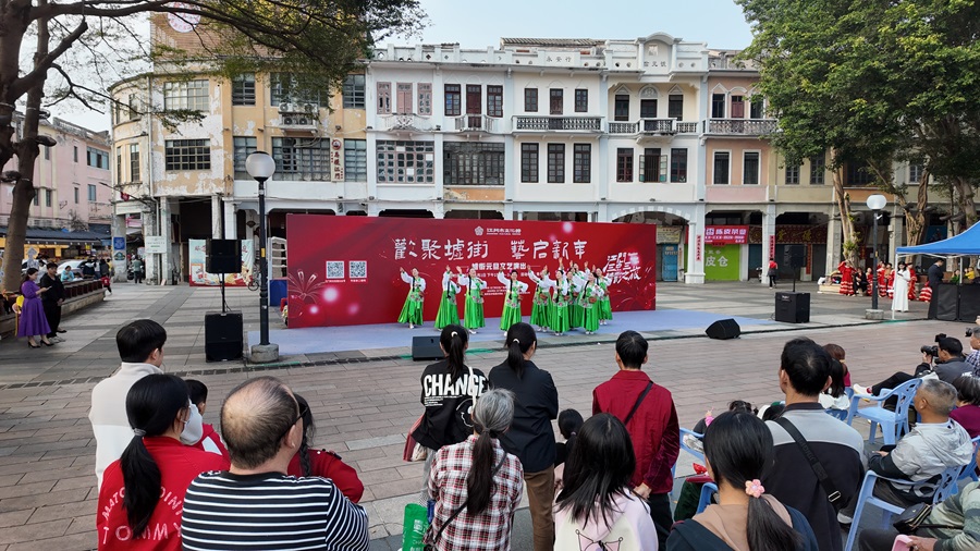 ????“祝大家新年快樂!”在青年廣場上,“歡聚墟街樂啟新年”文藝演出準(zhǔn)時(shí)上演,街頭音樂婉轉(zhuǎn)悠揚(yáng),舞蹈表演活力四射,粵劇選段韻味悠長,武術(shù)展示剛勁有力,非遺與現(xiàn)代藝術(shù)的融合贏得陣陣掌聲。