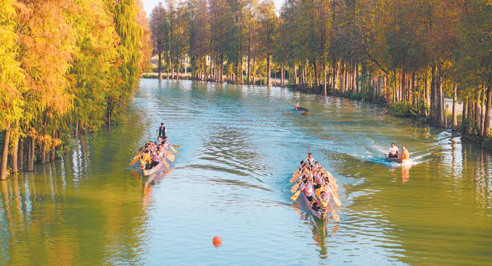 ????在禮樂(lè)禮聯(lián)龍舟基地,冠軍團(tuán)隊(duì)成員穿上救生裝備,在龍舟上與禮樂(lè)當(dāng)?shù)佚堉劢阂黄鸷狭ο蚯皠潣?,沉浸式體驗(yàn)“禮樂(lè)龍舟”這一省級(jí)非遺的獨(dú)特魅力。