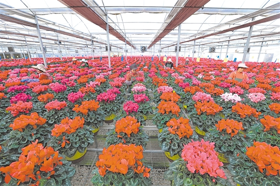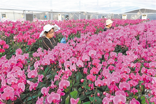 ????春節(jié)臨近,山東省青島市即墨區(qū)靈山花卉文化產(chǎn)業(yè)園的年宵花迎來生產(chǎn)和銷售旺季,花卉大棚內(nèi)的蝴蝶蘭、長壽花、仙客來等競相綻放,花農(nóng)們按照訂單外運各類花卉,供應(yīng)節(jié)日市場。