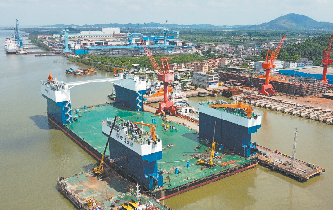 在海工裝備領域,江門企業(yè)近年來表現(xiàn)搶眼。圖為中交四航局江門航通船業(yè)有限公司建成的全球最大寬扁淺吃水型半潛駁船“四航永興”號。黃勝攝