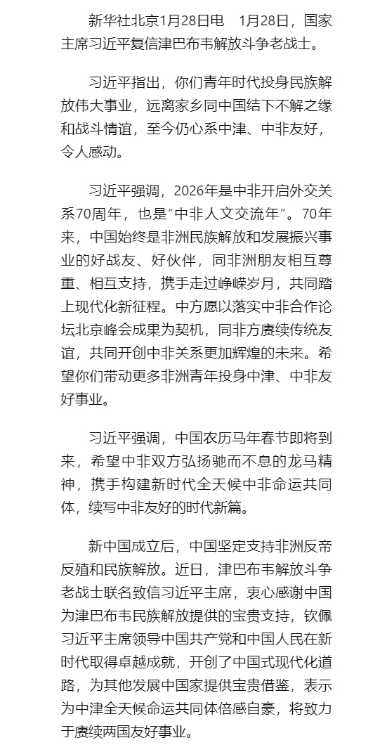 習(xí)近平復(fù)信津巴布韋老戰(zhàn)士