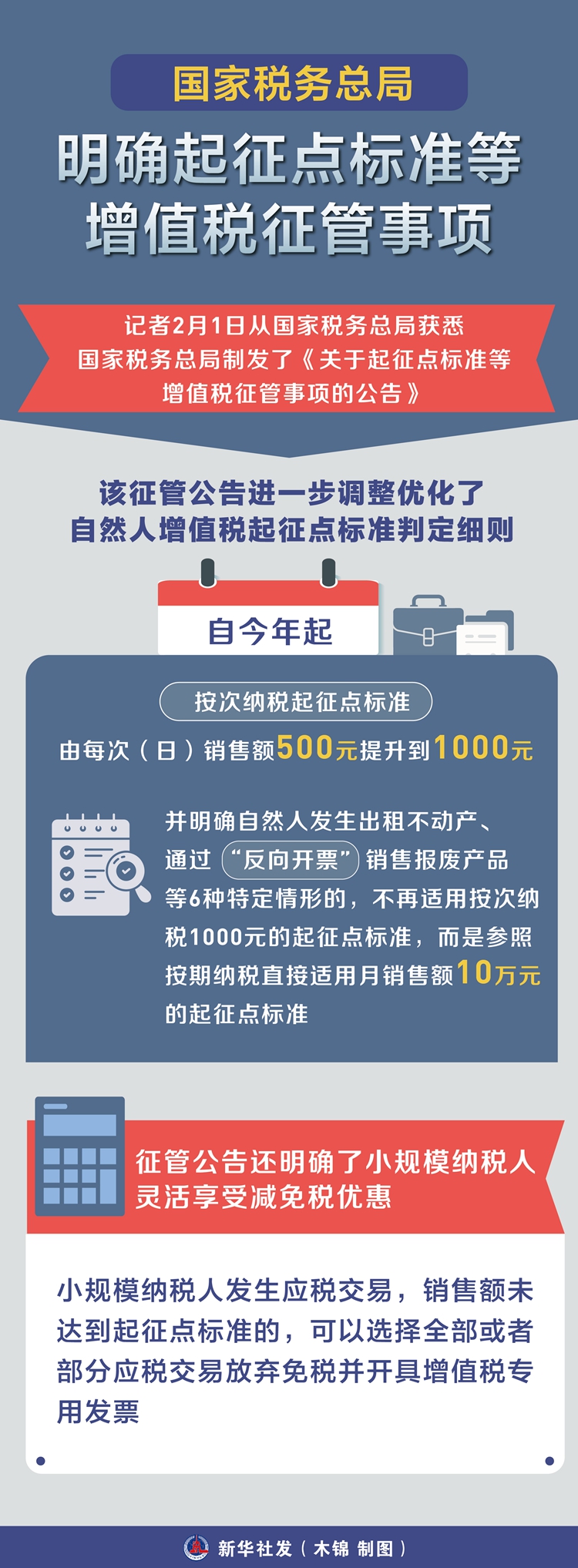 新華社北京2月1日電(記者劉開(kāi)雄)記者2月1日從國(guó)家稅務(wù)總局獲悉,國(guó)家稅務(wù)總局制發(fā)了《關(guān)于起征點(diǎn)標(biāo)準(zhǔn)等增值稅征管事項(xiàng)的公告》,就起征點(diǎn)標(biāo)準(zhǔn)判定、稅收優(yōu)惠政策適用等增值稅征管事項(xiàng)作了進(jìn)一步明確,細(xì)化操作要求,推動(dòng)增值稅法及其實(shí)施條例落實(shí)落地。