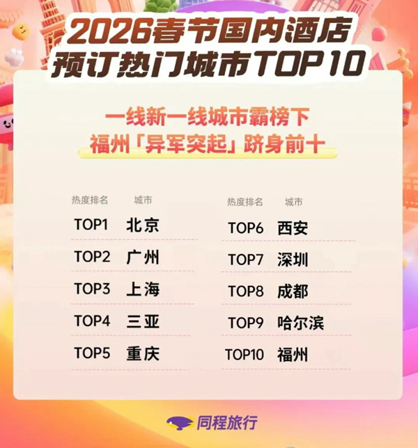 ??同程旅行數(shù)據(jù)顯示,春節(jié)國內(nèi)酒店預訂熱門城市TOP10榜單,基本被一線、新一線城市霸榜,但“國家歷史文化名城”福建福州闖出一席之地,躋身第10名。2025年,三坊七巷、煙臺山、上下杭等3個街區(qū)全年接待游客超5500萬人次,創(chuàng)歷史新高。