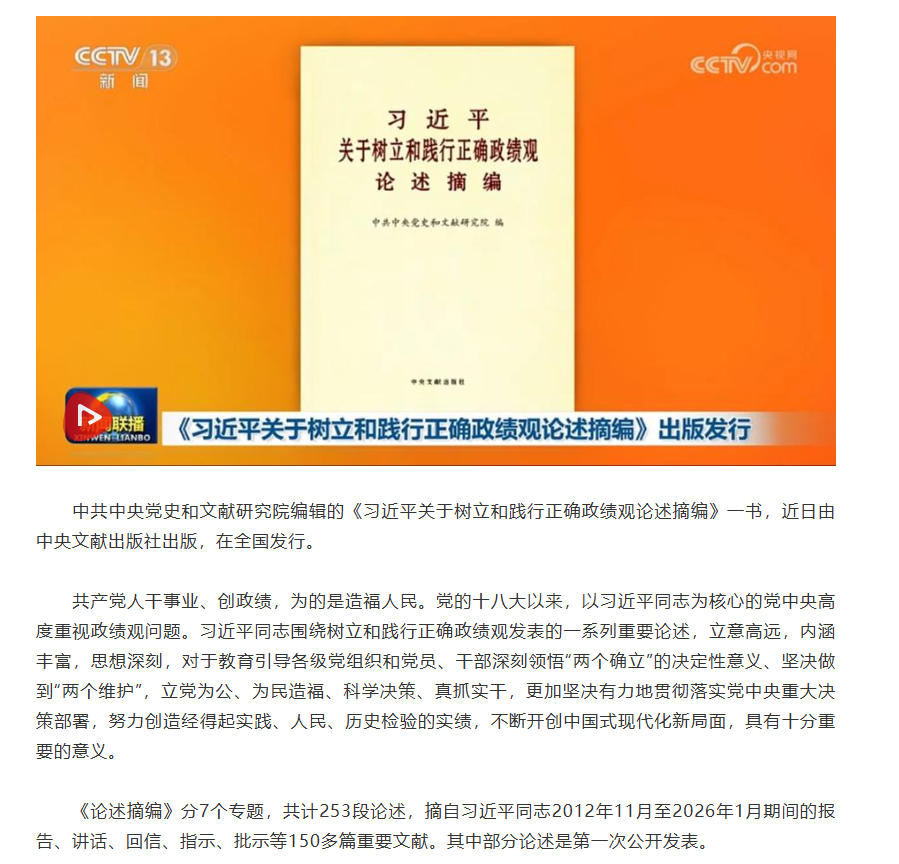 《習近平關(guān)于樹立和踐行正確政績觀論述摘編》出版發(fā)行