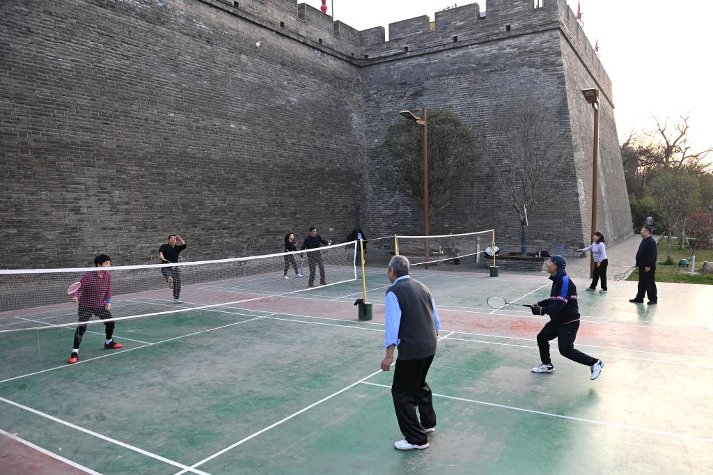 3月20日,市民在西安城墻環(huán)城公園文昌門至和平門段打羽毛球。新華社記者 李一博 攝