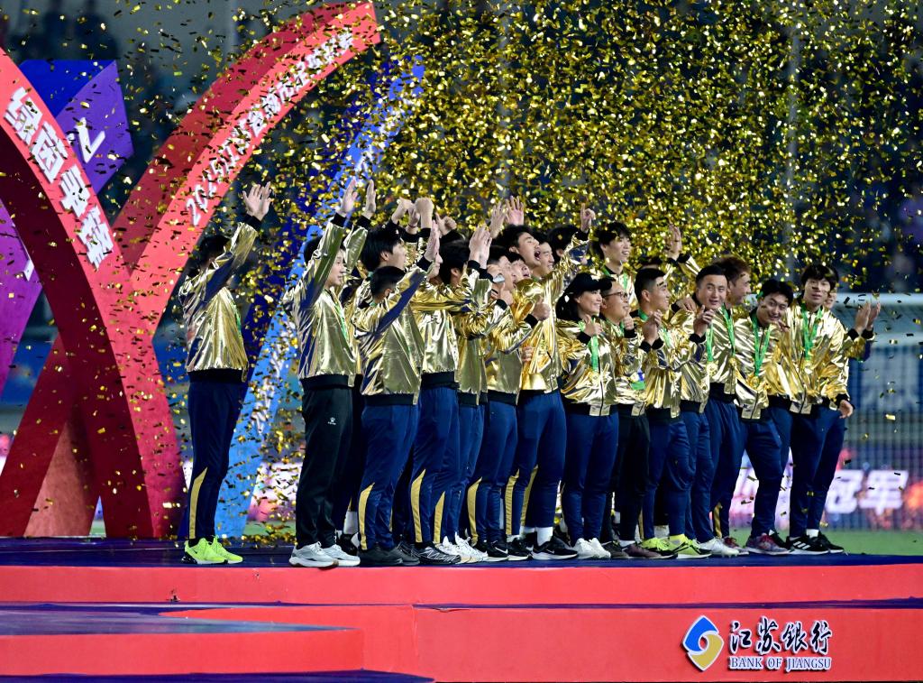 2025年11月1日,“蘇超”冠軍泰州隊(duì)在頒獎(jiǎng)儀式上慶祝。新華社發(fā)(曹政 攝)