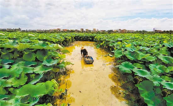 7月,新會的天氣炎熱,即便是坐在陰涼的大樹底下,也讓人直冒汗。現在正是大鰲鎮(zhèn)蓮藕收獲的季節(jié),在這里的蓮藕塘中是一片熱火朝天忙碌的景象。