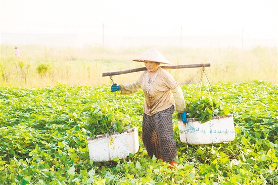 最近這段時間,在新會會城西盛村,有一群阿姨阿叔在田野上采摘番薯葉,一把一把地摘...