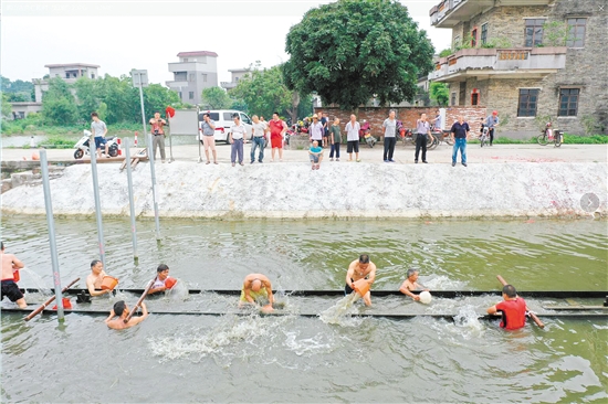 端午佳節(jié)將近,昨天早上,蓬江區(qū)棠下鎮(zhèn)沙富村舉行“起龍”儀式,“喚醒”抬出龍船塢里的龍舟。