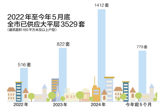 ????市住房和城鄉(xiāng)建設局提供的數(shù)據(jù)顯示,建筑面積在180平方米及以上的戶型2022年全市供應量516套,占比1.4%,到今年1—5月供應量就達到779套,占比提高至9.8%,供應量占比提升了6倍,比去年同期增長超200%。不難看出,大平層正成為時下改善型住宅市場乃至房地產市場的“香餑餑”。