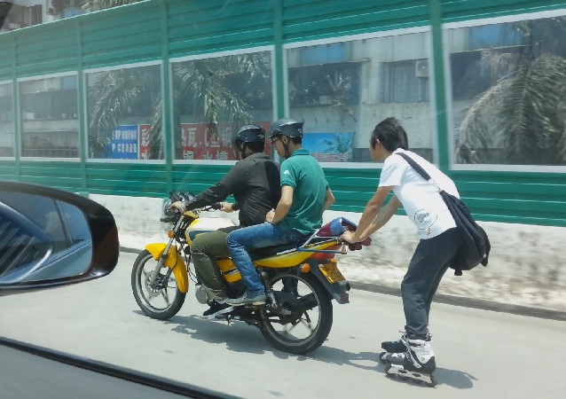兩男子在前面駕乘摩托車,另一男子不戴頭盔,拉著摩托車尾進(jìn)行輪滑運動,搭“順風(fēng)車”的同時還不忘玩玩手機(jī)。